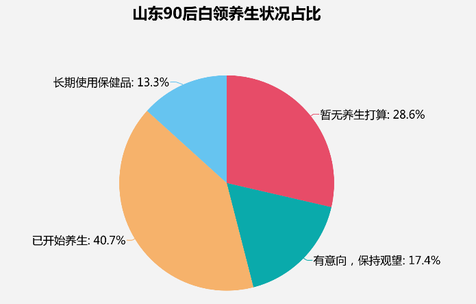 據(jù)統(tǒng)計(jì),現(xiàn)如今中國(guó)有一大部分年輕人都開(kāi)始注重養(yǎng)生,且山東省90后已經(jīng)有過(guò)半年輕人開(kāi)始養(yǎng)生。下圖為山東90后白領(lǐng)養(yǎng)生狀況占比,據(jù)調(diào)查顯示,已有40.7%的白領(lǐng)開(kāi)始養(yǎng)生;更有13.3%白領(lǐng)表示長(zhǎng)期在使用保健品;有17.4%的白領(lǐng)意向養(yǎng)生并持觀望態(tài)度;僅有28.6%的白領(lǐng)表示無(wú)養(yǎng)生打算。