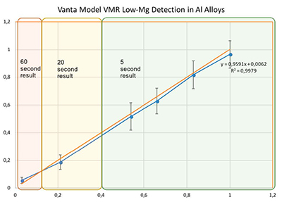 要想快速探究鋁合金當中的少量鎂元素一直都是手持式光譜儀需要攻克的難題,因為要準確地探定鋁合金當中的鎂元素會需要很長的檢測時間。隨著經濟不斷發展,工程師們也對硬件技術的進步以及先進的Axon技術的采用,而奧林巴斯Vanta光譜儀的技術已經可以大大縮短鋁合金中準確的低含量鎂元素的檢測時間。