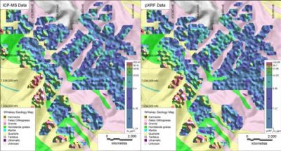 來(lái)自加拿大的金元素勘探項(xiàng)目,XRF分析儀在野外繪制的表面土壤中As、Cu和Pb元素等值線圖對(duì)比ICP分析。