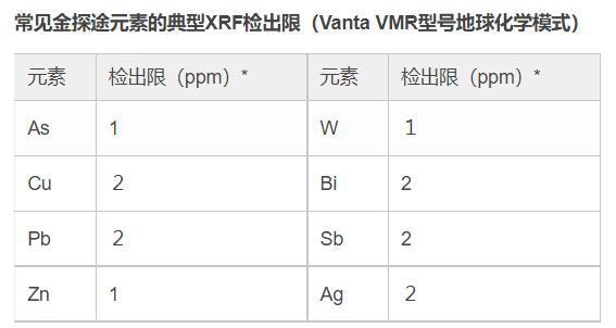 大多數(shù)金礦床都有其特定的地球化學(xué)特征(如上表所示)。XRF分析儀可以探測(cè)到這些地球化學(xué)特征,從而可使地質(zhì)學(xué)家更清楚地了解他們正在勘查的地質(zhì)系統(tǒng)。典型的金探途元素包含As、Cu、Pb、Zn、Sb、Bi、Ag和W。