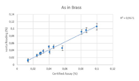此外,Vanta分析儀還可以有效地測(cè)量會(huì)影響飲用水安全的多種其它元素,如:砷(As)和鎘(Cd)。下面顯示的是分析儀檢測(cè)多種黃銅認(rèn)證參考材料時(shí)獲得的有關(guān)其它有毒元素的檢測(cè)結(jié)果。