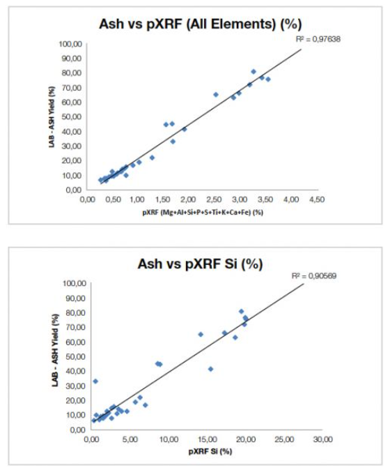 圖1. 奧林巴斯手持式XRF光譜儀獲得的數據與經認證的參考材料額定值之間有著密切的關聯性,因此使用組合輕元素替代物(Mg+Al+Si+P+S+Ti+K+Ca+Fe)或僅使用二氧化硅可以有效地估算灰分含量。如果元素組中的元素更全,還可以獲得更好的結果。
