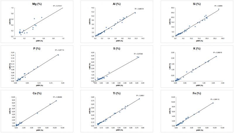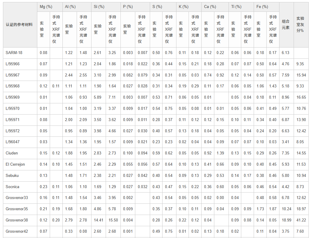 圖2. 奧林巴斯手持式XRF光譜儀檢測大量煤認證參考材料(CRM)獲得的結果與這些材料的標稱值高度吻合。上面的圖表表明對于重要元素:Mg、Al、Si、P、S、K、Ca、Ti和Fe,實驗室認證值和XRF分析儀獲得的數據值在準確性和精確性方面都表現出高度的一致性。 數據表包含了繪制這些圖表所依據的實驗室數據和XRF數據。數據承蒙新南威爾士大學生物和地球科學學院提供 - ACARP項目。