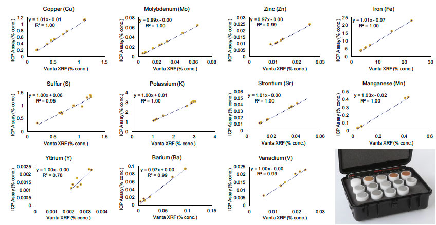 CODES團隊展示了他們對使用傳統ICP-MS/ICP-ES(電感耦合等離子體質譜法和發射光譜法)和手持式XRF分析儀檢測來自六個礦區的樣品所獲得結果進行比較的情況:(1)美國Yerington斑巖銅礦區(±鉬-金);(2)美國Resolution斑巖銅-鉬礦床;(3)秘魯Las Bambas銅-鐵矽卡巖礦區;(4)澳大利亞Cadia銅-金礦區;(5)澳大利亞Northparkes銅-金礦區;(6)澳大利亞Cowal銅-金礦區。