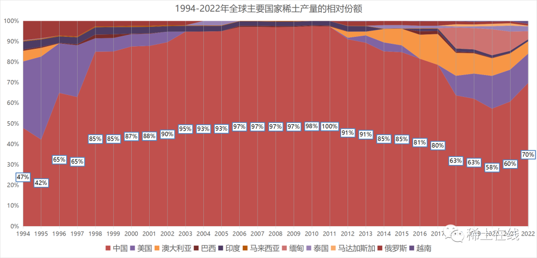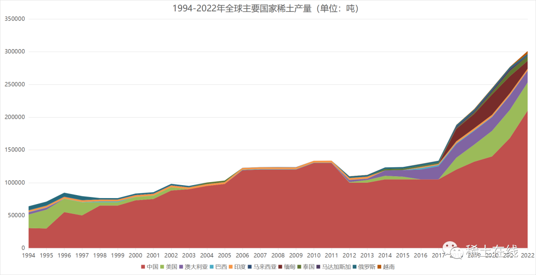 2022年全球稀土礦產量竟達到了30萬噸,而中國占比提升至70%