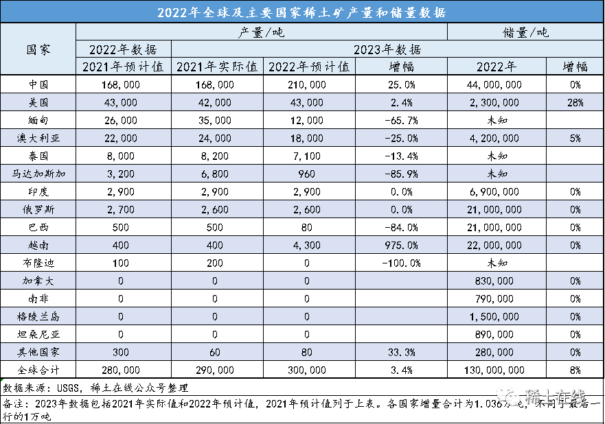 2022年全球稀土礦產量30萬噸,相比于2021年實際值增加1萬噸,增幅3.4%,小于2021年的16.7%,增速放緩,主要國家稀土礦產量見下表。