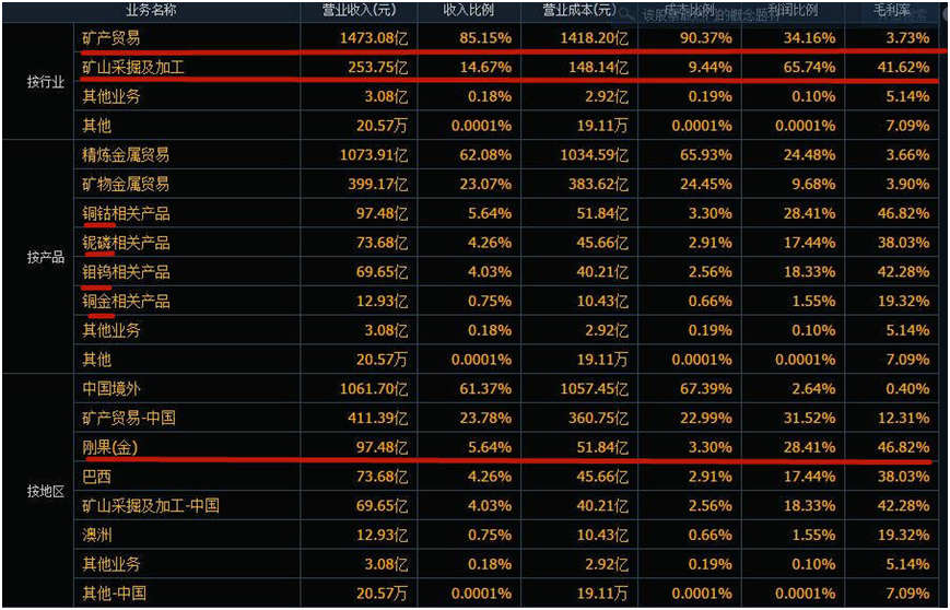 2022年,洛陽鉬業(yè)實現(xiàn)營業(yè)收入1729.91億元,凈利潤為60.67億元,雖然創(chuàng)造歷史最好業(yè)績,但相比于近2000億元的營收,其實際的凈利潤率并不高,而細看主營業(yè)務(wù),其占了收入85%的礦產(chǎn)貿(mào)易,毛利率只有3.73%!而其礦產(chǎn)采掘和加工的業(yè)務(wù)的毛利率達到了41.62%,貢獻了總利潤的65.74%。