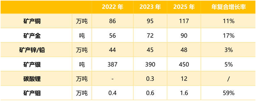 紫金礦業(yè)主要在全球范圍內(nèi)從事銅、金、鋅、鋰等金屬礦產(chǎn)資源勘查、開發(fā)及工程設(shè)計、技術(shù)應(yīng)用等業(yè)務(wù)。以大型超大型礦產(chǎn)的逆周期并購自主地質(zhì)勘探增儲為重點,這也為紫金礦業(yè)持續(xù)發(fā)展提供了堅實的資源基礎(chǔ)。截至 2022 年 底,公司保有探明和控制及推斷的資源量: 銅 7371.86 萬噸、金 3117.39 噸、鋅(鉛)1118.33 萬噸、銀 14611.80 噸,鋰資源量(當量碳酸鋰) 1215.21 萬噸。銅權(quán)益儲量占中國儲量 92%,金權(quán)益儲量占中國儲量 40%,是中國控制有色金屬礦產(chǎn)資源最多的大型礦業(yè)公司。