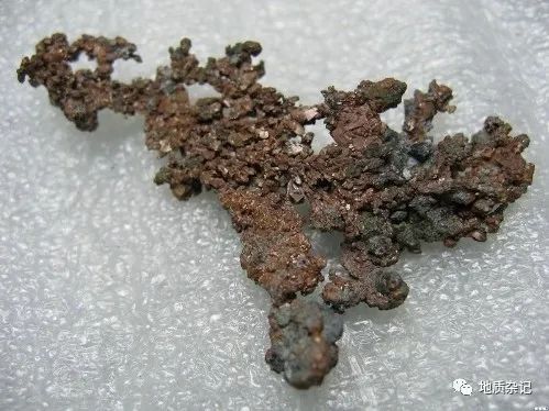 成分Cu,原生自然銅成分中有時含銀和金等。等軸晶系。晶體呈立方體,但少見;一般呈樹枝狀、片狀或致密塊狀集合體。銅紅色,表面易氧化成褐黑色。條痕呈光亮的銅紅色。金屬光澤。硬度2.5~3。具強延展性。斷口呈鋸齒狀。為電和熱的良導體。密度8.5~8.9g/cm3