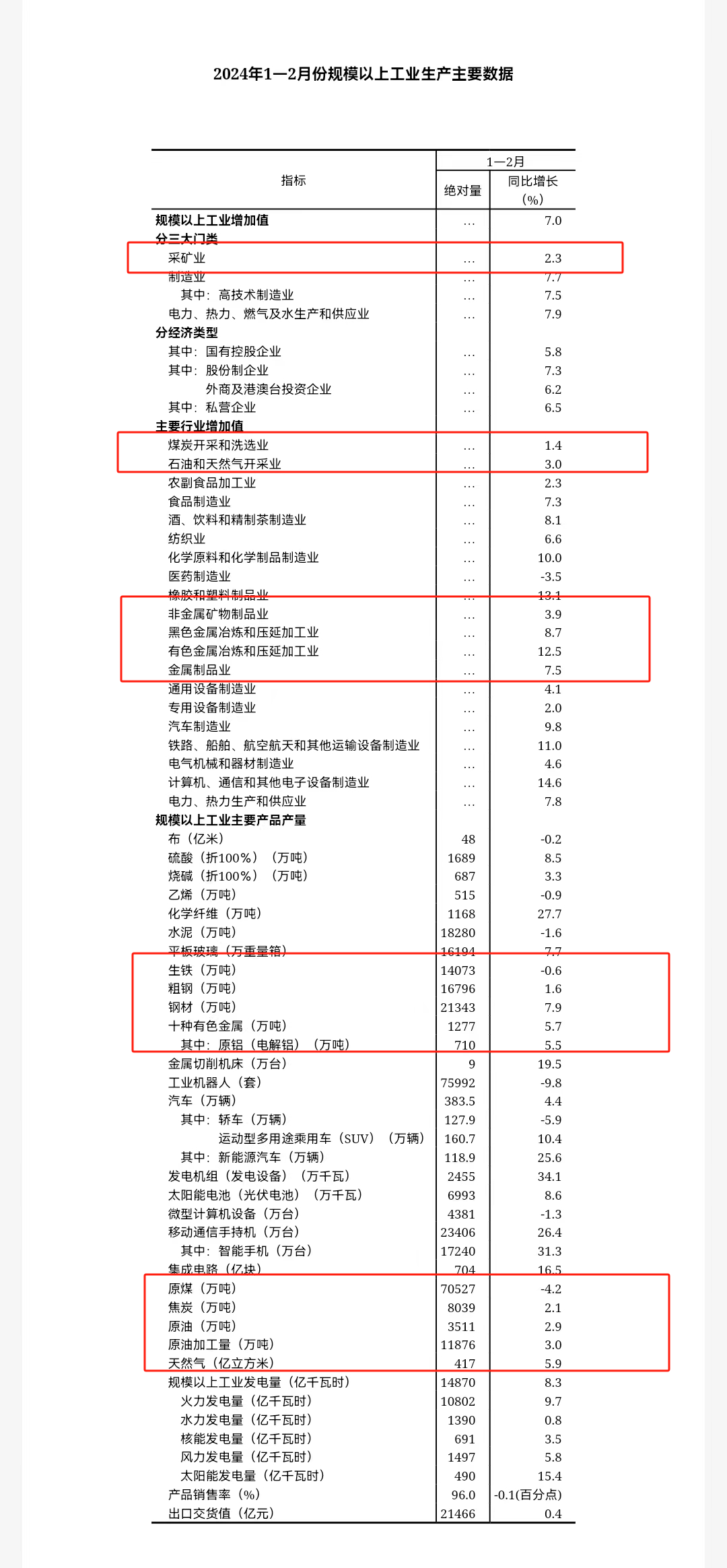 分行業(yè)看,1—2月份,41個(gè)大類行業(yè)中有39個(gè)行業(yè)增加值保持同比增長(zhǎng)。其中,涉礦主要行業(yè)利潤(rùn)情況如下:煤炭開(kāi)采和洗選業(yè)增長(zhǎng)1.4%,石油和天然氣開(kāi)采業(yè)增長(zhǎng)3.0%,金屬礦物制品業(yè)增長(zhǎng)3.9%,黑色金屬冶煉和壓延加工業(yè)增長(zhǎng)8.7%,有色金屬冶煉和壓延加工業(yè)增長(zhǎng)12.5%。
