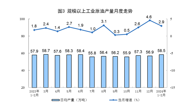 原油生產(chǎn)穩(wěn)定增長(zhǎng),進(jìn)口增速加快。1—2月份,規(guī)上工業(yè)原油產(chǎn)量3511萬(wàn)噸,同比增長(zhǎng)2.9%。進(jìn)口原油8831萬(wàn)噸,同比增長(zhǎng)5.1%,增速比上年12月份加快4.5個(gè)百分點(diǎn)。