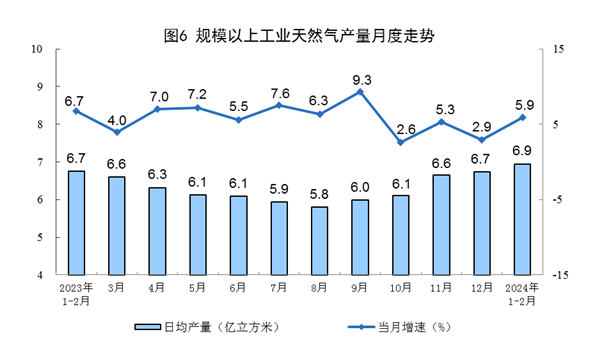 天然氣生產(chǎn)增速加快,進(jìn)口保持較快增長(zhǎng)。1—2月份,規(guī)上工業(yè)天然氣產(chǎn)量417億立方米,同比增長(zhǎng)5.9%。進(jìn)口天然氣2210萬(wàn)噸,同比增長(zhǎng)23.6%,增速比上年12月份放緩0.1個(gè)百分點(diǎn)。