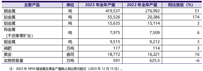 洛陽鉬業(yè)年報(bào)披露,公司去年所有產(chǎn)品產(chǎn)量全部實(shí)現(xiàn)同比增長,銅、鈷、鈮、磷創(chuàng)歷史新高。具體來看,公司實(shí)現(xiàn)產(chǎn)銅產(chǎn)量41.95萬噸,同比增長51.46%,排名中國第二,接近全球前十;鈷產(chǎn)量5.55萬噸,同比增長174.31%,成為全球第一大鈷生產(chǎn)商。中國區(qū)鉬、鎢產(chǎn)量為15,635噸和7,975噸,全球保持領(lǐng)先地位。巴西鈮和磷肥產(chǎn)量為9,515噸和116.82萬噸,創(chuàng)歷史新高。澳大利亞NPM銅、金產(chǎn)量分別為25,550噸和18,772盎司。