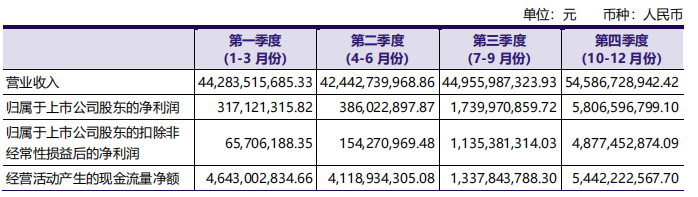 年報(bào)數(shù)據(jù)顯示,2023年,公司實(shí)現(xiàn)營業(yè)收入1862.69億元,同比增長7.68%;實(shí)現(xiàn)歸屬于母公司凈利潤82.50億元,同比增長36%,雙雙創(chuàng)下歷史新高。其中,第四季度實(shí)現(xiàn)盈利58.07億元,同比增長257.89%,創(chuàng)下有史以來單季度盈利新高。