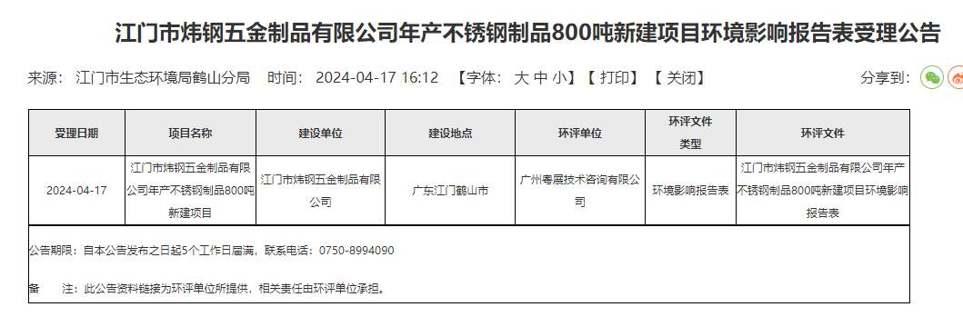 鶴山市人民政府消息,4月17日,江門市生態環境局鶴山分局受理江門市煒鋼五金制品有限公司年產不銹鋼制品800噸新建項目環境影響報告表并對外進行公告,公告期:5個工作日。
