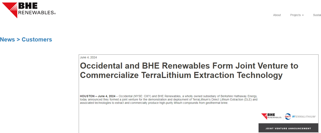 BHE Renewables在新聞稿中介紹,TerraLithium是西方石油公司的全資子公司,擁有DLE技術的專利,這些技術有可能將任何含鋰鹵水加工成高純度鋰。BHE可再生能源在加利福尼亞州的帝國谷運營著10個地熱發電廠,這些工廠每分鐘處理50,000加侖富含鋰的鹵水,生產345兆瓦的清潔能源。
