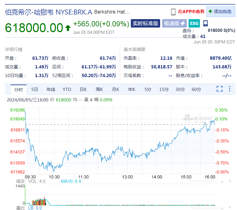 據悉,巴菲特從2019年首次投資西方石油,2022年一季度開始連續三個季度大幅增持。今年2月初,巴菲特曾連續三個交易日增持西方石油,累計購買430萬股。截至當地時間6月5日收盤,伯克希爾-哈撒韋美股報618000美元,漲幅0.09%,市值8879.40億美元。