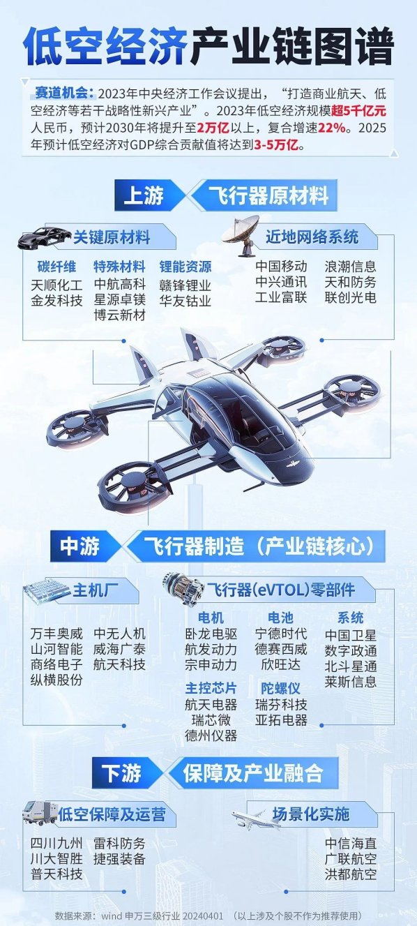 從2019年起,低空空域逐步放開,國家政策持續(xù)扶持低空經(jīng)濟(jì)的發(fā)展。今年3月份,“低空經(jīng)濟(jì)”首次寫入《政府工作報告》。同樣是在3月,工業(yè)和信息化部、科學(xué)技術(shù)部、財政部、中國民用航空局聯(lián)合印發(fā)《通用航空裝備創(chuàng)新應(yīng)用實施方案(2024—2030年)》,提出到2030年,推動低空經(jīng)濟(jì)形成萬億級市場規(guī)模。