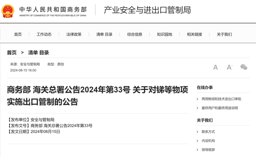 15日下午,商務(wù)部、海關(guān)總署聯(lián)合發(fā)布了《關(guān)于對(duì)銻等物項(xiàng)實(shí)施出口管制的公告》(下稱(chēng)“公告”)。公告顯示,根據(jù)相關(guān)規(guī)定,為維護(hù)國(guó)家安全和利益、履行防擴(kuò)散等國(guó)際義務(wù),經(jīng)國(guó)務(wù)院批準(zhǔn),決定對(duì)銻等物項(xiàng)實(shí)施出口管制。公告自2024年9月15日起正式實(shí)施。