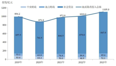 年報顯示,從2023年全國非油氣地質(zhì)勘查投入資金來源看,中央財政為46.23億元,占總量的23%,同比增長10.6%;地方財政為85.04億元,占總量的42.4%,同比增長0.7%;社會資金為69.45億元,占總量的34.6%,同比增長15.5%。從資金投向看,礦產(chǎn)勘查為117.56億元,占總量的58.5%;基礎(chǔ)地質(zhì)調(diào)查為22.23億元,占總量的11.1%;水文地質(zhì)、環(huán)境地質(zhì)與地質(zhì)災(zāi)害調(diào)查評價為38.33億元,占總量的19.1%;地質(zhì)科技與綜合研究為20.28億元,占總量的10.1%;地質(zhì)資料服務(wù)與信息化為2.32億元,占總量的1.2%。