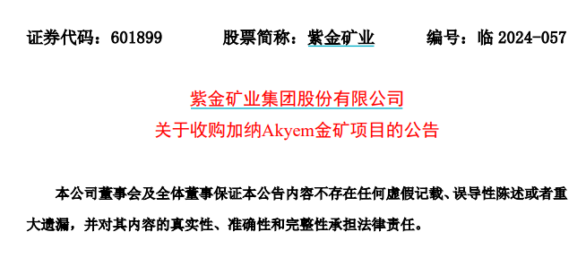 2024年10月9日,紫金礦業宣布擬出資10億美元(約70.71億人民幣)收購紐蒙特全資子公司Newmont Golden Ridge Ltd的100%股權,拿下加納Akyem金礦項目的全部權益。這是紫金礦業自2020年以來的第7宗金礦并購,標志著公司在全球金礦布局的持續加強。Akyem金礦擁有黃金資源量54.4噸,儲量約34.6噸,年均產金約5.8噸。