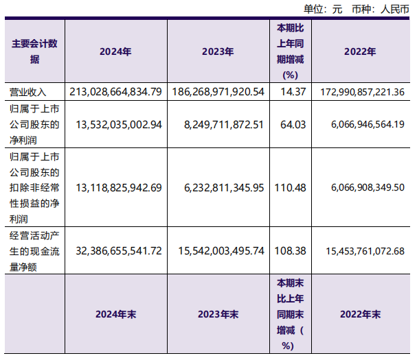 3月21日,洛陽鉬業發布的業績報告顯示,公司2024年營業收入首次邁入兩千億元門檻,為2130.29億元,同比增長14.37%;歸母凈利潤首破百億元,為135.32億元,同比增長64.03%;扣非后歸母凈利潤131.19億元,同比增長110.48%;每股收益0.63元,同比增長65.79%。