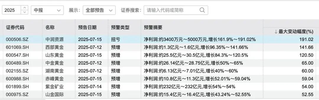 據Wind統計,已披露業績預告的8家金礦股,上半年凈利潤合計317.613億元~328.063億元。其中,頭部企業的規模優勢進一步放大。