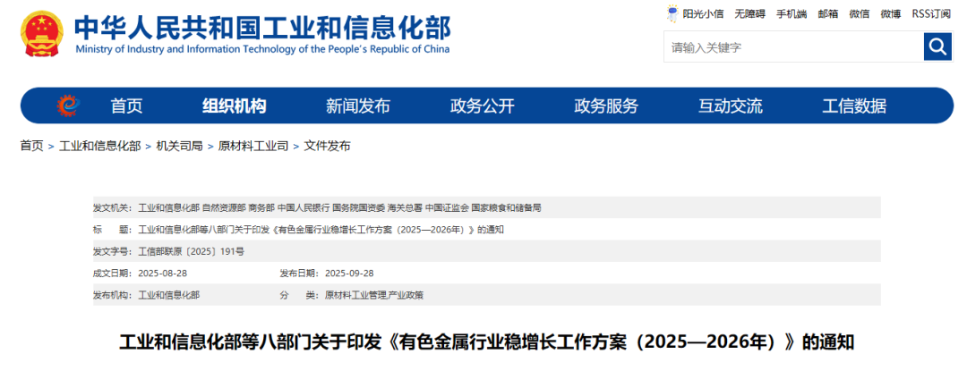 近日,工業和信息化部、自然資源部、商務部等八部門聯合印發《有色金屬行業穩增長工作方案(2025-2026年)》(以下簡稱《工作方案》)。